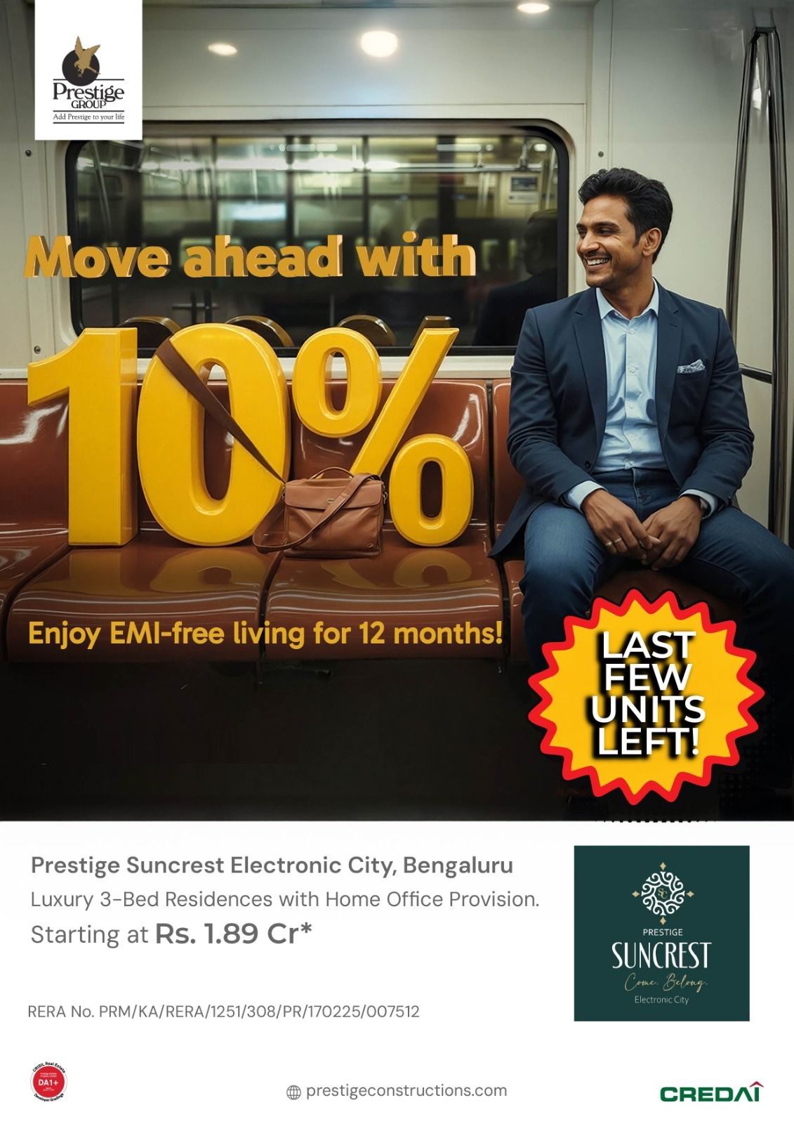Prestige Suncrest will be constructed on 6 Acres of land parcel consisting 2 Towers with 2 Basement + Ground + 24 floors having 2BHK, 3BHK, 3.5BHK premium residences. Prestige Suncity Project is located Off Hosur Road, Bommasandra, Electronic City Phase 1, Bangalore with - Hosur Road - 2.8km, D Mart Electronic City - 3.3km, Mazumdar Shaw Medical Center - 4.7km. Prestige Suncrest Electronic City Project first is internal amenities - Vitrified Tile..., Branded Fittings, Kitchen Platform, Ss Sink, CCTV & many more. Prestige Group Electronic City External Amenities Project has 30+ luxurious amenities with likes of - Clubhouse, Multipurpose Hall, Amphitheater, Tennis Court,Billiards & Many More. Prestige Suncrest Electronic City Phase -1 Project has one type of car parking facility - Basement. Prestige Sun City Possession - Rera Possession - September 2029 and Target Possession - December 2028. Built-up Area & Floor Plan of Prestige Suncrest South Bangalore project has 1BHK, 2BHK, 3BHK premium residences with - 2BHK - [1230 to 1279] sqft and 3BHK - (1452 to 2005)sqft. Prestige Suncrest floor plan will have 8 flats 4 lifts & 2 staircases on each floor. Prestige Suncrest Price & its details can be found in the price section & Prestige Suncrest Sanjay Nagar brochure can be downloaded from the link mentioned below. Project has been praised by the home buyers & Prestige Electronic City Phase 1 review is 4 out of 5 from over all the clients who have visited the site.